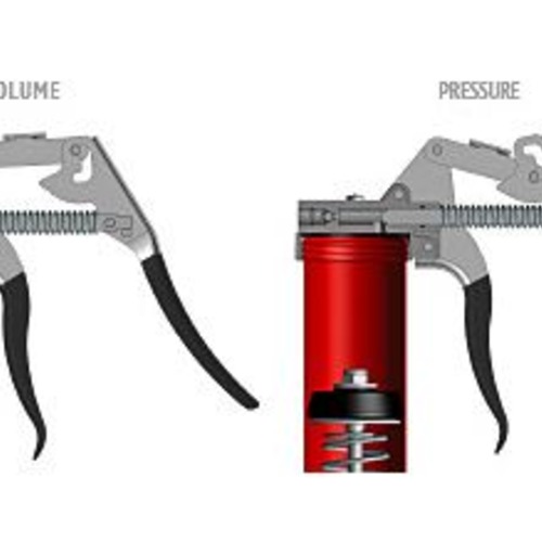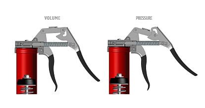 - Von einer Fettförderung mit hohem Volumen auf hohen Druck ist mit dem Handgriff umstellbar