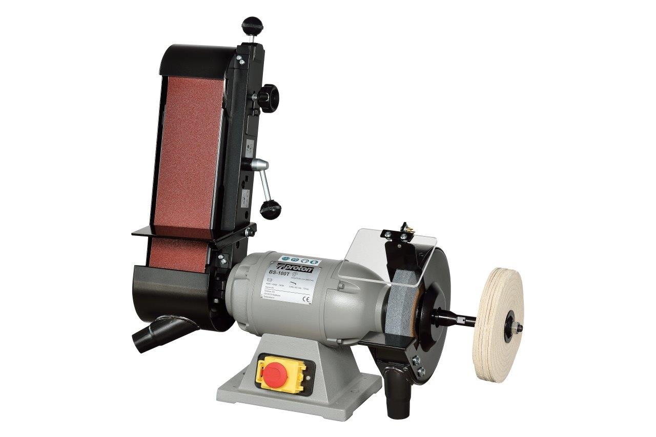 PROTON Bandschleifmaschine: Vibrationsarmer Motor, Thermischer Motorschutz, Notausschalter, Wellenverlängerung, Schwabbelscheibe, Splitterschutz aus Plexiglas