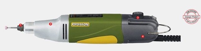 Ein Schnellläufer mit balanciertem Gleichstrom (DC)-Spezialmotor. Stufenlose elektronische Drehzahlregelung (Vollwellenelektronik). Kugelgelagerte Präzisionswelle aus geschliffenem Stahl. Mit 6 dreifach geschlitzten MICROMOT-Stahlspannzangen (1,0 - 1,5 - 2,0 - 2,4 - 3.0 und 3,2 mm inklusive Spannmutter). Stabiler Getriebekopf aus Alu-Druckguss mit 20 mm-MICROMOT-Systempassung für den Einsatz in Bohr- und Horizontalständern. Hauptgehäuse aus glasfaserverstärktem POLYAMID.