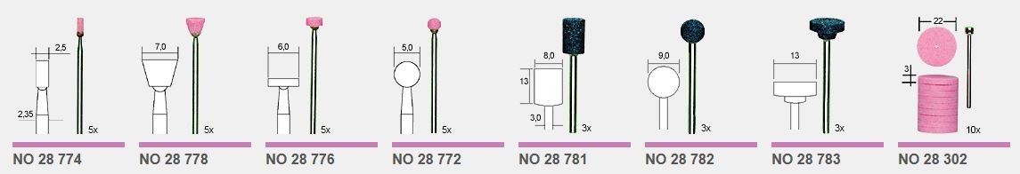 Schleifer aus feinen, hochwertigen Materialien mit gleichmäßiger Härte. Verschiedene Formen für breiten Anwendungsbereich. Zum Schleifen und Ziselieren von harten Werkstoffen wie Gusseisen, Stahlguss, Temperguss, legierten und vergüteten Stählen. Maßgenaue Schäfte sorgen für ordentlichen Rundlauf. Die Schäfte haben einen Durchmesser von 2,35 oder 3.